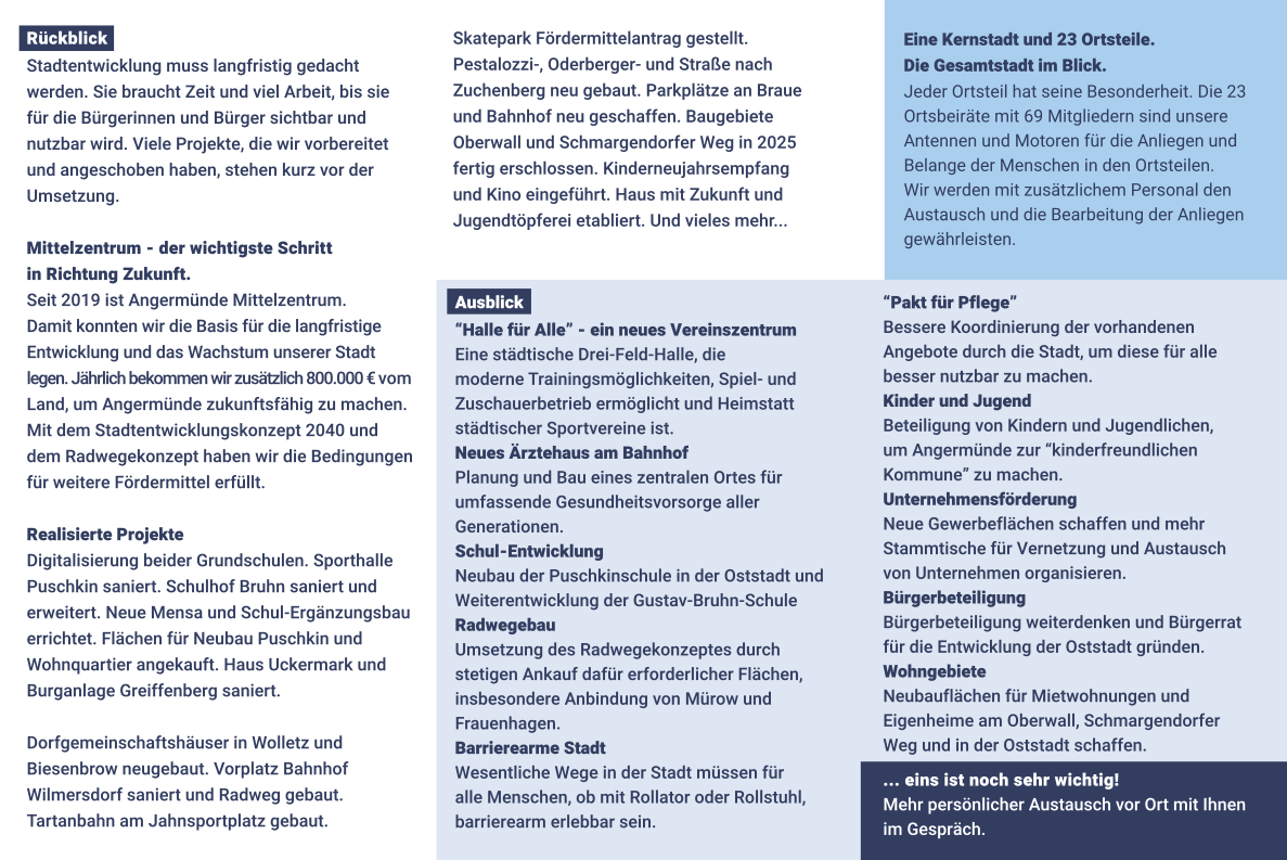 Es ist viel zu tun, um Angermünde und seine 23 Ortsteile stabil in die Zukunft zu führen. Neben vielen, vielen Aufgaben, welche das Amt des Bürgermeisters mit sich bringt, sind folgende Themen meine Schwerpunkte. Die Aufzählung stellt dabei keine Wertigkeit dar.